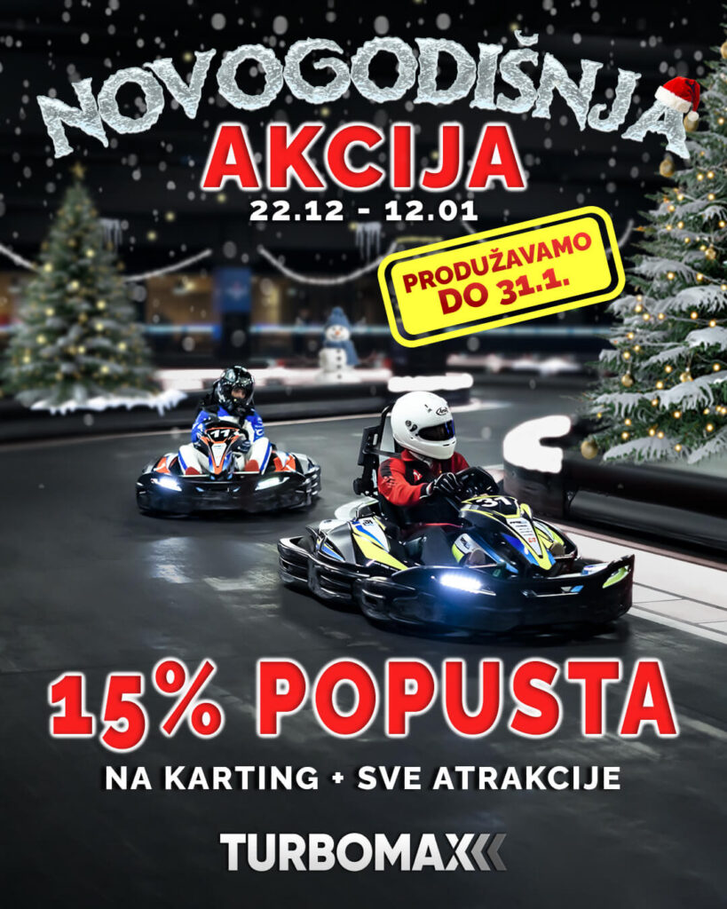 Do kraja januara čeka te 15% POPUSTA na karting i sve naše atrakcije. Dođi sa ekipom, porodicom ili ekipom s posla – garantovan je sjajan provod i nezaboravna energija. Vidimo se na stazi!